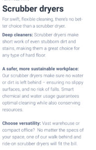 Contact JeffScrubVac present the Nilfisk-Advance professional range of scrubber dryer products, ranging from small cabled walk-behinds for hard floor cleaning in small areas to large battery-powered ride-ons that clean up to 6,200 m² per hour. In short, products for cleaning everything from light commercial areas to industrial premises.